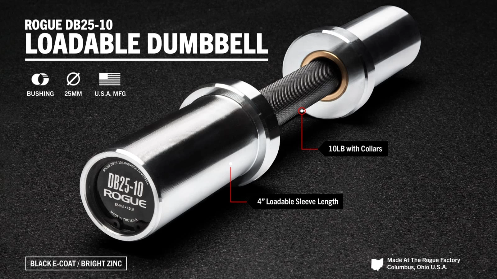 An alternative option to our standard DB-10 and DB-15 Loadable Dumbbells, the DB25-10 adapts its design from the Rogue Bella Bar rather than the Ohio Bar, resulting in a smaller handle diameter (25mm vs 28.5mm), reduced distance between the collars (5” vs 5.5”), and a different knurl pattern. This model also combines Bright Zinc sleeves with a striking Black E-Coat shaft finish, known for its excellent adhesion, even coverage, and overall toughness.