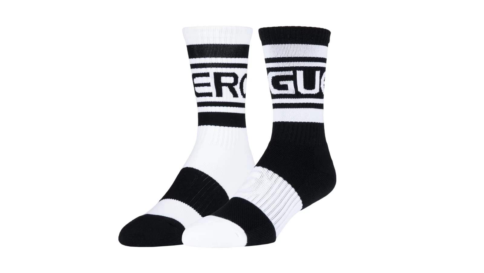 This new variation on the official Rogue Sock from Skyline features a “mismatch” stripe pattern in Black / White, with Rogue branding above the ankle.