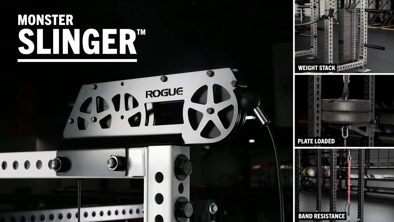 Now available with your choice of either band-loaded or plate-loaded resistance, the new Rogue Monster Slinger™ is a rack-mounted cable-pulley system designed to deliver the same training benefits of a traditional Lat Pulldown Machine with better space and cost efficiency. This attachment is compatible exclusively with our Monster Series Power Racks, and comes with adjustable components for set-up on a 90”, 100”, or 108” unit. Every customer also has the option of adding a compatible Pioneer Leather Tricep Strap, and/or a Rogue Stainless Steel Lat Bar Attachment to their order at an extra cost.