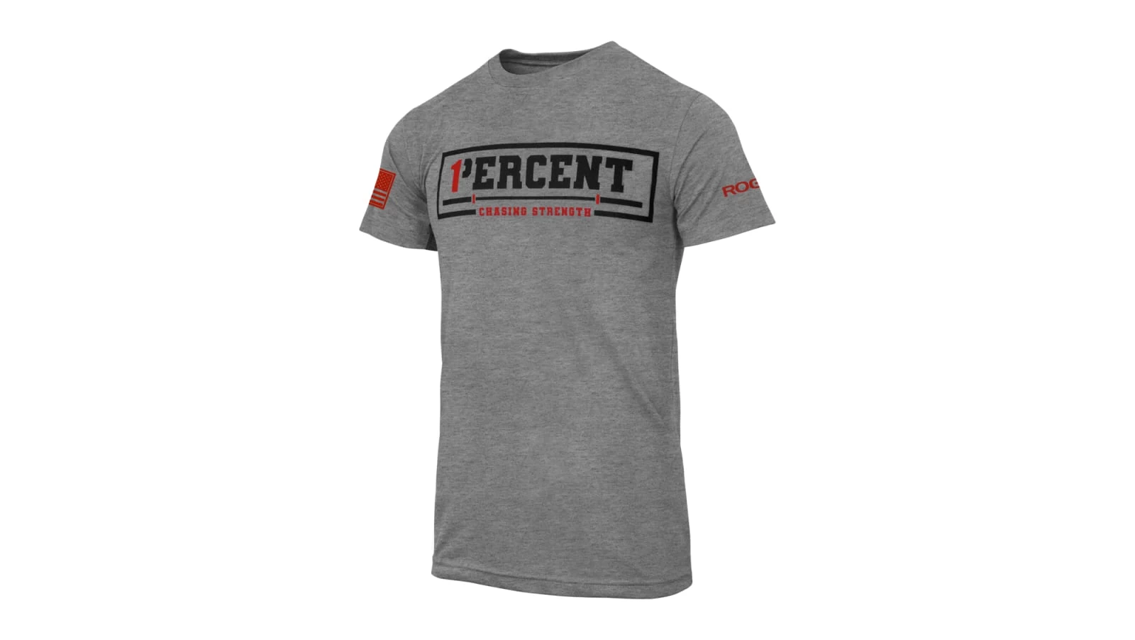 This Gray, American-made crewneck t-shirt features a soft tri-blend construction with Ryan’s “1 Percent: Chasing Strength” logo across the chest in red and black. The American flag is featured on the right sleeve and the Rogue logo on the left.