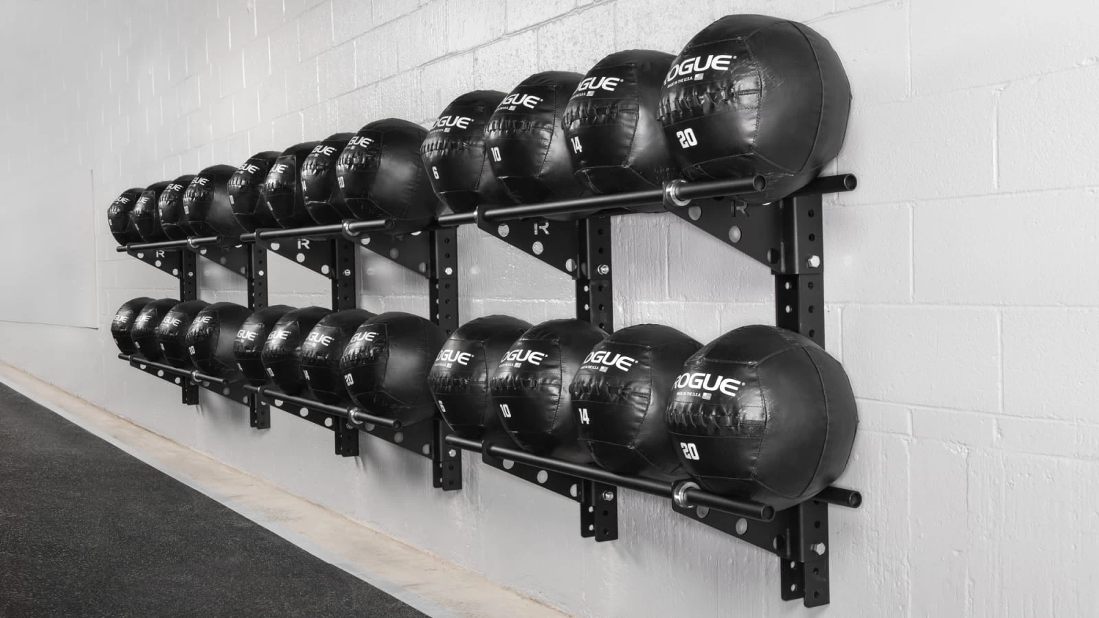 For any gym with more than a few medicine balls and less than enough storage space, Rogue Swiss Brackets are the zero footprint solution. Sold in pairs, these 0.1857″ thick laser cut steel brackets (packaged with a set of four shaft collars) allow gym owners to install a customized, wall-mounted medball storage rack in virtually any size training space.