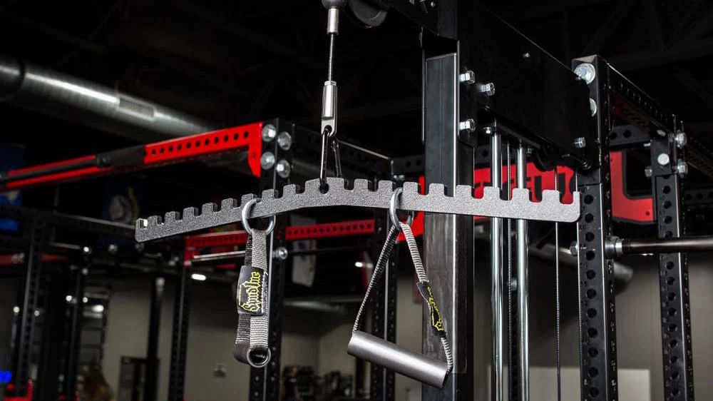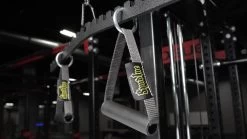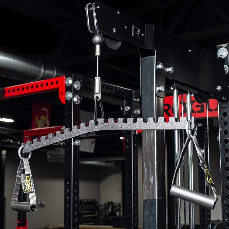 It looks like a medieval torture device, but the Lat Saw attachment from Spud Inc. is actually a precision, micro-adjustable new tool for working the lat muscles. The solid metal construction of the main unit includes incremental 1” rungs for attaching either a set of Cable Handles or Spud Inc. Dynamite Sticks. This allows athletes to quickly and easily switch between wide and narrow grips without having to replace any equipment. Different hand angles also enable more options for easing or increasing focus on the grip, forearms, biceps, etc.