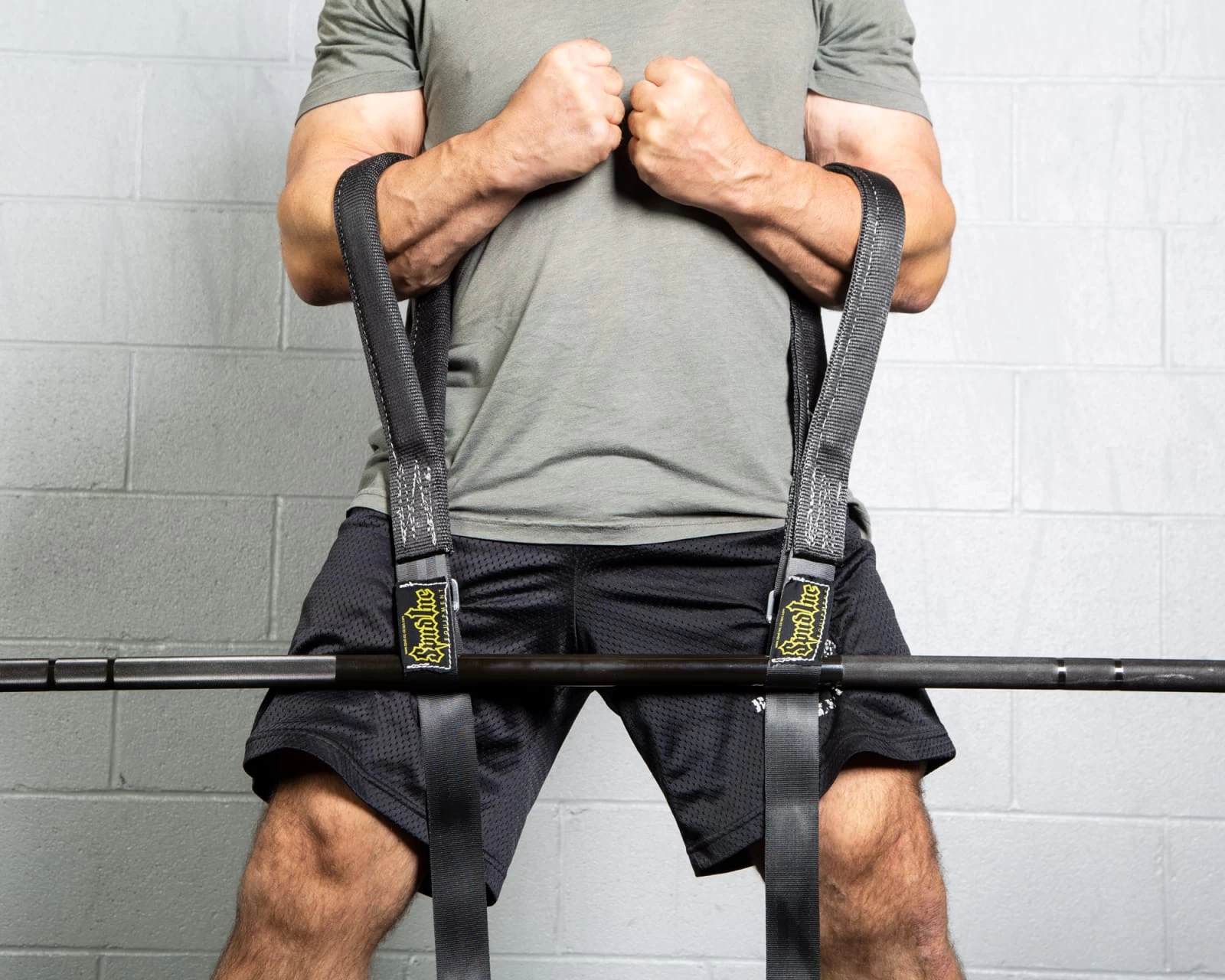 Spud Inc’s Zercher Straps have a wide range of applications, including use with a barbell from the floor, off a rack, or even connected to a belt squat machine. The straps are designed with a thick tapered padding that fits snuggly into the arms without shredding up the forearms or biceps as you train.